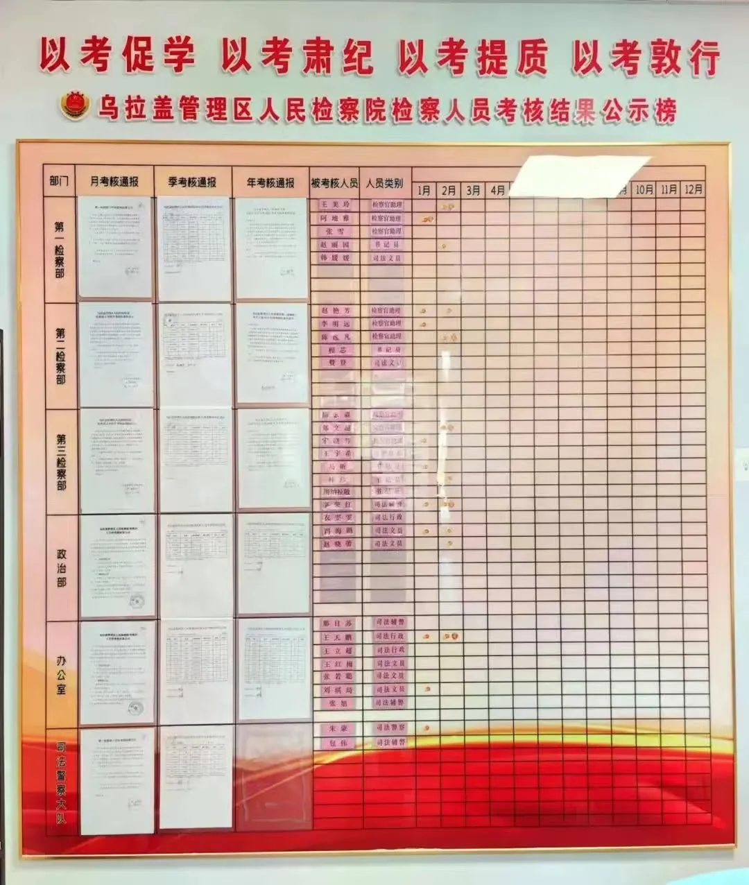 (四)突出做好日常考核。不断健全完善检察人员日常考核评价机制,在制定参加集体学习、考勤考纪、遵纪守规、日常工作等共性考核指标的基础上,根据核心业务数据,制定案件质效个性考核指标,分层分类制定考核标准,每月对考核情况进行通报。另外,同步制定出台《党员积分管理办法》,明确党员、发展对象、入党积极分子积分明细标准,用积分情况评定现实表现, 真正做到以考促学、以考肃纪、以考提质,以考促行。
